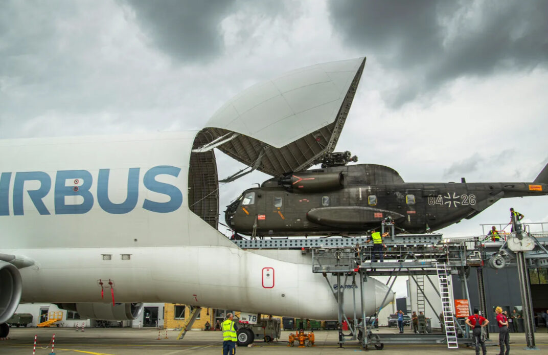 El Beluga tiene un sistema de puertas de carga de apertura frontal único que lo diferencia de otros aviones de transporte. El extremo delantero del avión se abre formando una entrada tan amplia como la boca de una ballena, lo que facilita la carga y descarga de mercancías de gran tamaño, como un helicóptero, por ejemplo. Este diseño es clave para mover con eficacia