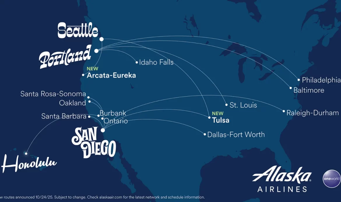 Alaska Airlines presentó un plan de expansión para la primavera de 2026 que contempla el lanzamiento de 13 nuevas rutas sin escalas, centrándose especialmente en sus hubs de San Diego International Airport (SAN) y Portland International Airport (PDX). Esta iniciativa incluye la adición de dos destinos inéditos en su red: Tulsa International Airport (TUL) en Oklahoma y Arcata–Eureka Airport (ACV) en la costa de California, elevando el total de ciudades servidas por el grupo a 142 para 2026.